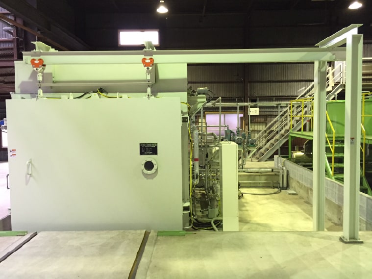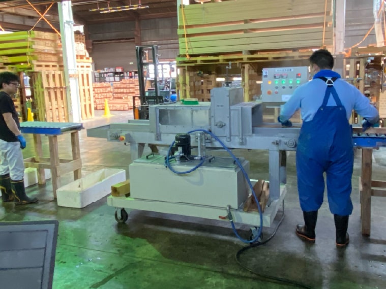 金属製のバットに木材を入れ、含浸装置に挿入します。