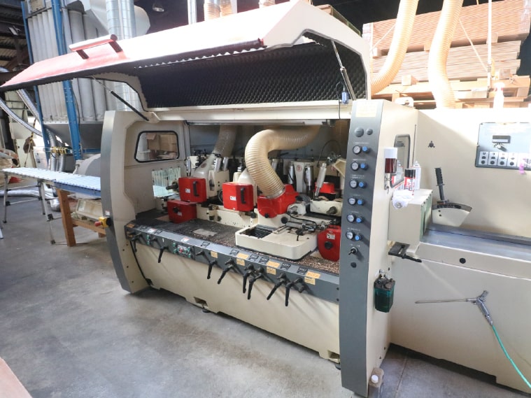 6つの回転刃(軸)を持ち、木材の上下左右、さらに上面や底面など複数の面を一度に削って滑らかに仕上げたり、複雑な形状に成形したりできる設備です。