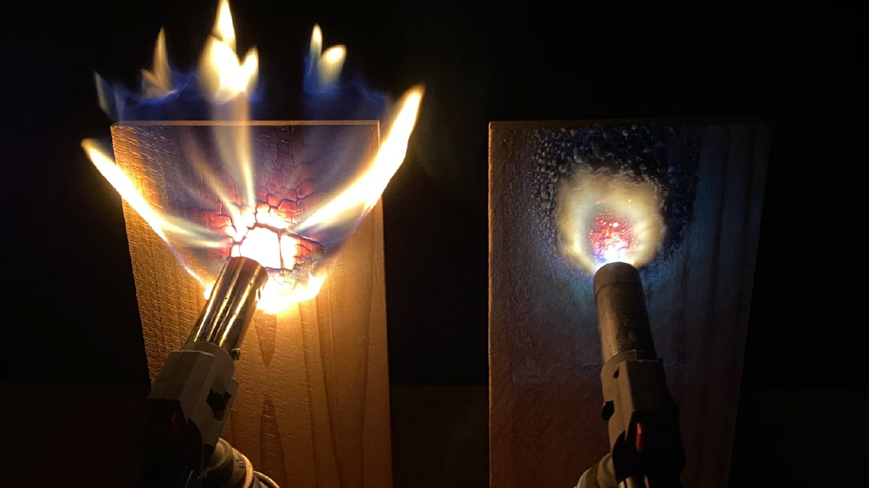 無施工木材(左)は炎をあげて燃えているが、不燃木材(右)は焦げはあるものの炎はなく、燃え広がる事も無い事が見てとれる。